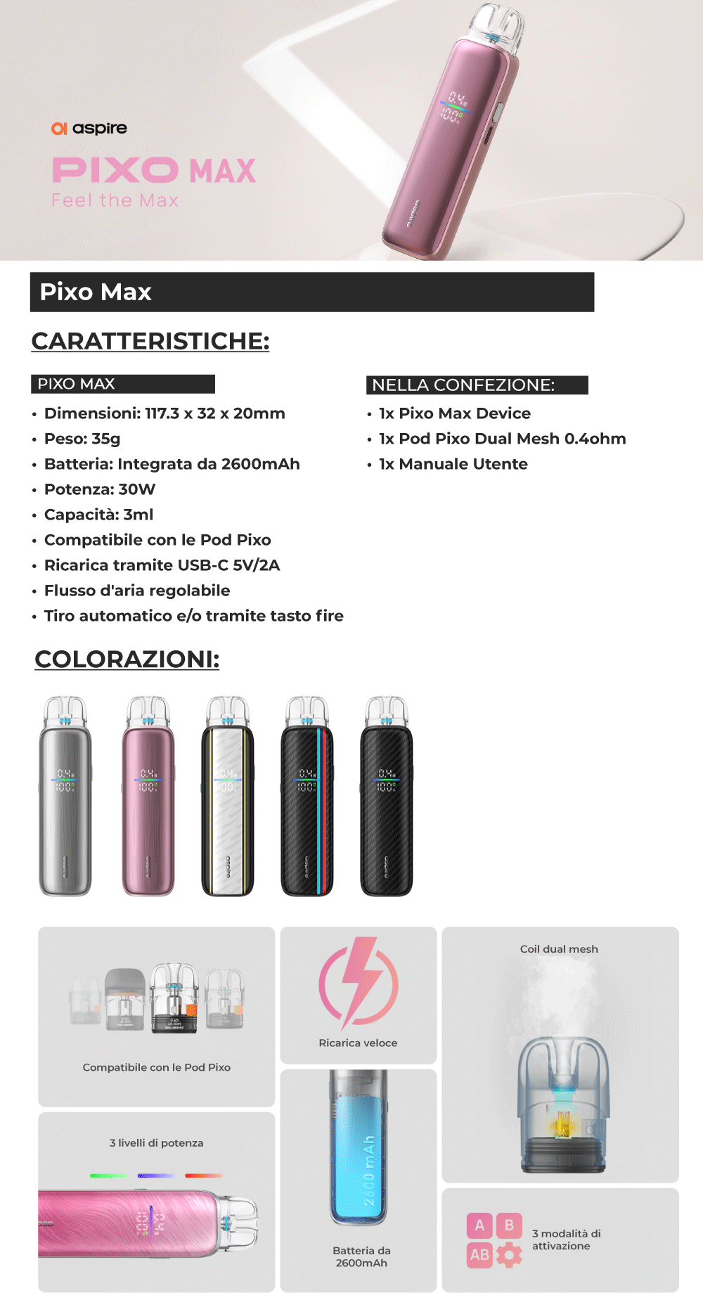Aspire presenta la Pixo Max, una pod mod sottile ed elegante adatta ad un tiro da guancia (MTL) e semi polmonare (RDL). E' alimentata da una batteria integrata da 2600mAh ricaricabile tramite USB-C. La potenza è regolabile e può raggiungere 30W con tre livelli a scelta tra ECO, NORMAL e MAX. Il tiro può essere sia automatico che tramite tasto fire o con la combinazione di entrambi i sistemi. Il flusso d'aria è regolabile tramite lo slider posto sul lato. Ha un doppio display: è indicata la resistenza della coil sullo schermo superiore, il livello della batteria su quello inferiore e un indicatore LED centrale mostra lo stato del dispositivo.