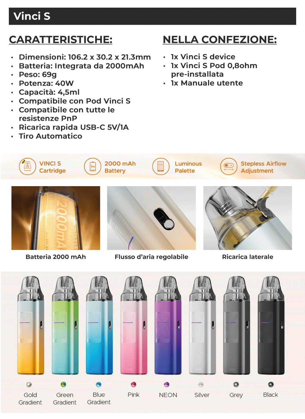 Voopoo presenta la Vinci S, una pod mod adatta ad un tiro da guancia (MTL) e semi polmonare (RDL). E' alimentata da una batteria integrata da 2000mAh ricaricabile tramite USB-C.